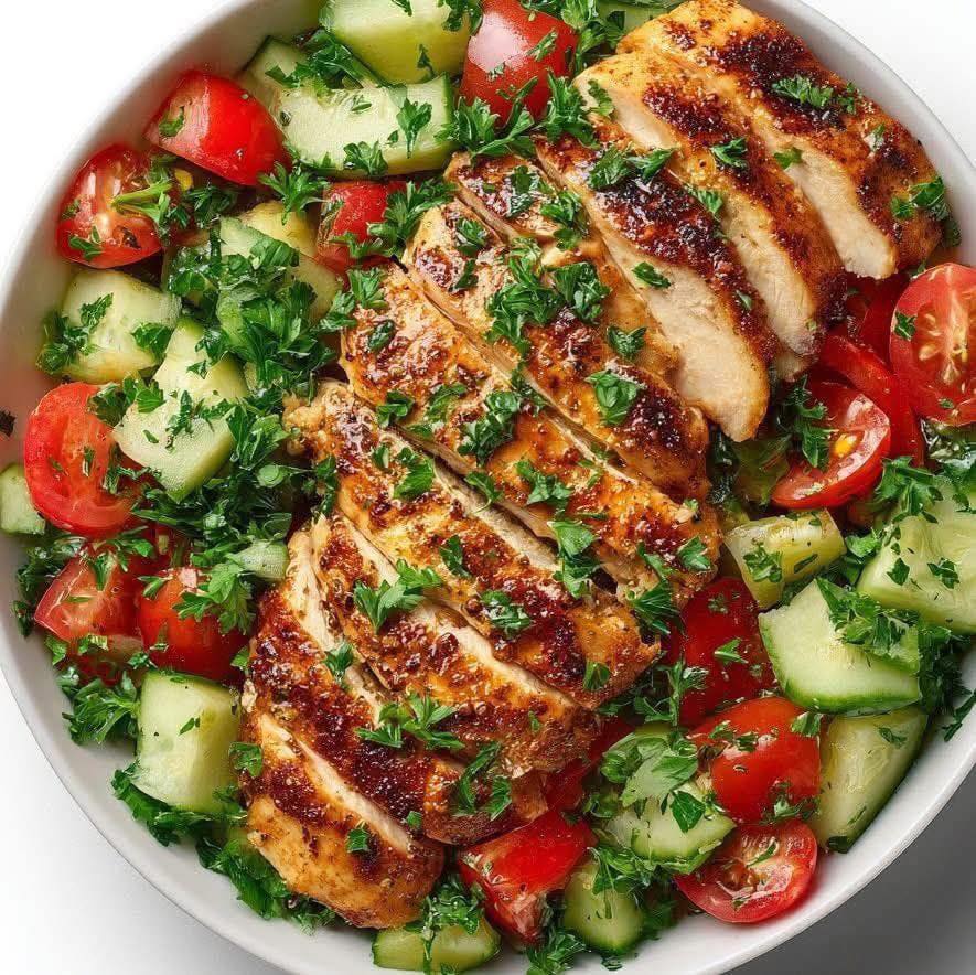 While the chicken marinates, assemble the salad. In a large serving bowl, combine the chopped tomatoes, sliced cucumber, and red onion. Sprinkle the chopped parsley over the top but do not toss yet. Set aside.