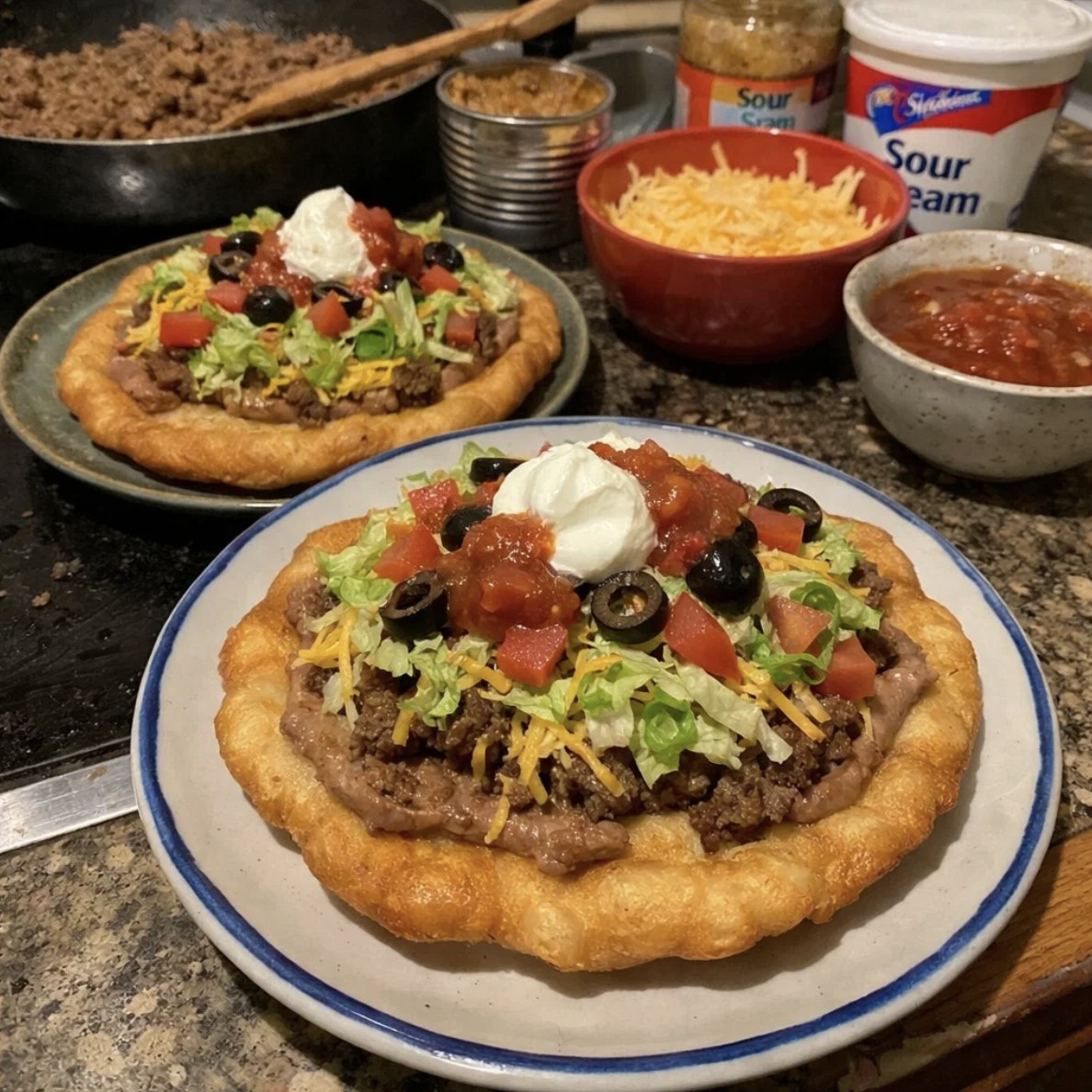 Place one warm, puffy fry bread on a plate. Spoon a generous helping of the hot meat and bean mixture onto the center. Top with shredded lettuce, diced tomato, red onion, and a hearty handful of cheese. Finish with a dollop of sour cream, jalapeño slices, a sprinkle of cilantro, and a dash of hot sauce if desired.