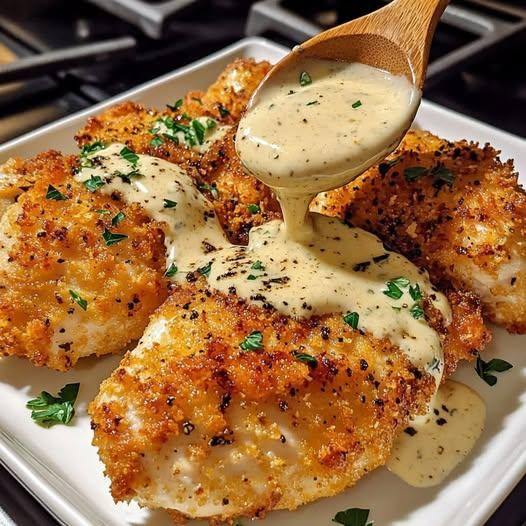 PARMESAN CRUSTED CHICKEN WITH CREAMY GARLIC SAUCE